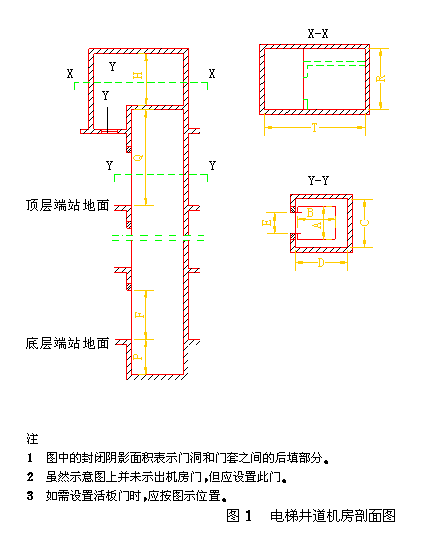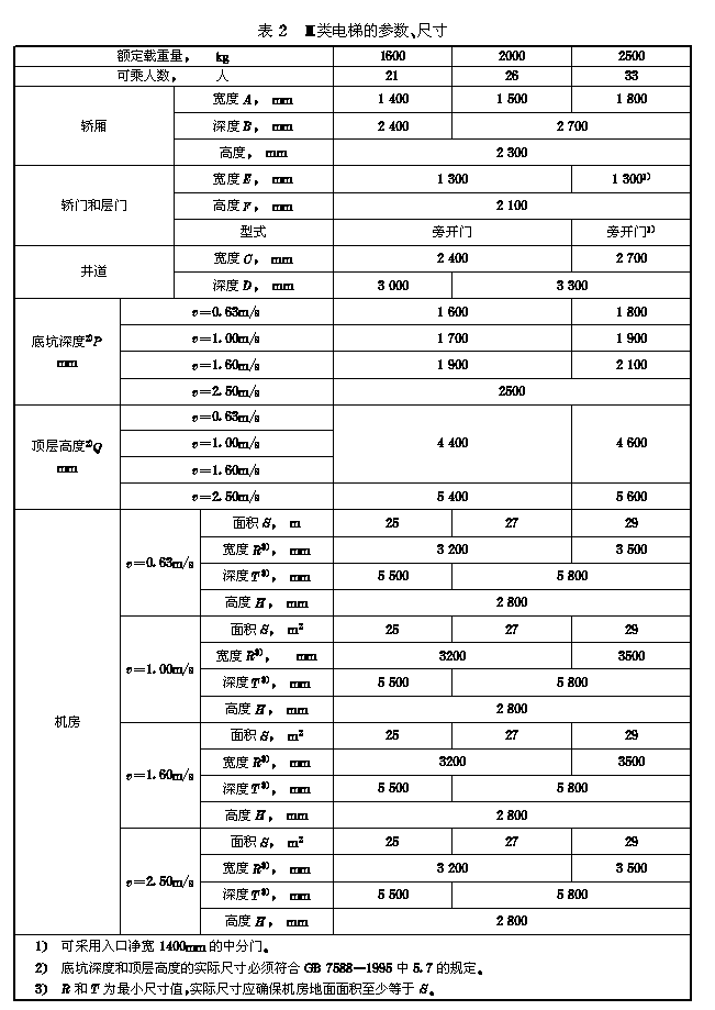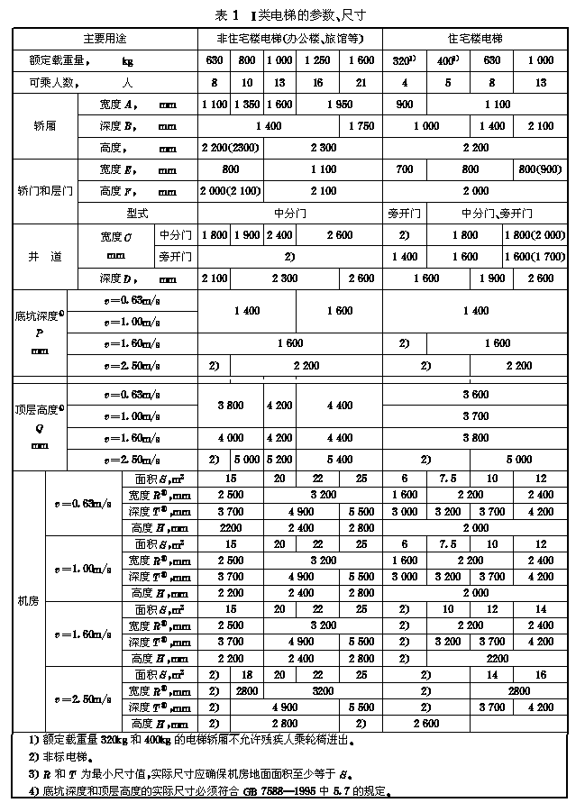 轿厢、井道、机房的型式与尺寸 根据电梯主参数所确定的各类电梯的轿厢、井道、机房的型式与尺寸应符合下列规定。 5.1 Ⅰ类电梯 非住宅楼电梯的轿厢、井道、机房的型式与尺寸见表1、图2。 住宅楼电梯的轿厢、井道、机房的型式与尺寸见表1、图1、图3。图1注: 1图中的封闭阴影面积表示门洞和门套之间的后填部分。 2虽然示意图上并未示出机房门,但应设置此门。 3如需设置活板门时,应按图示位置。 5.2 Ⅲ类电梯 病床电梯的轿厢、井道、机房的型式与尺寸见表2、图1、图4。 5.3 Ⅱ类电梯的轿厢、井道、机房的型式与尺寸应从Ⅰ类和Ⅲ类电梯的尺寸中选择。 |