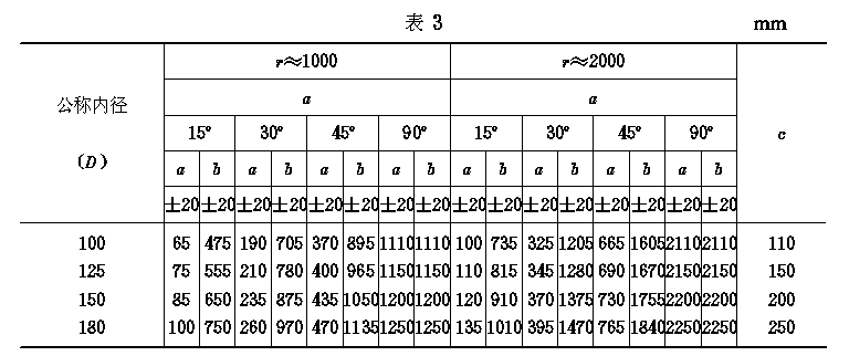 弯管的型式、尺寸及标记 弯管的型式分臂架用和非臂架用两种。 3.1 臂架用弯管的弯曲半径及弯曲角度见图2。 臂架用弯管应采用B型法兰连接。 3.1.1 臂架用弯管的公称内径按 表2的规定。 3.1.2 标记示例 公称内径D=125mm,用B型法兰连接的90°弯管: 弯管90—125BJJ83—91 3.2 非臂架用弯管的弯曲半径及弯曲角度见图3。 非臂架用弯管应采用A型法兰或B型法兰连接。 3.2.1 非臂架用弯管的尺寸及弯曲角度按表3的规定。 3.2.2 标记示例 公称内径D=125mm,弯曲半径r=1000mm,用A型法兰连接的90°弯管:弯管90—125A—1000JJ83—91 |