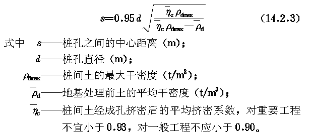 14.2.3 桩孔直径宜为300~450mm,并可根据所选用的成孔设备或成孔方法确定。桩孔宜按等边三角形布置,桩孔之间的中心距离,可为桩孔直径的2.0~2.5倍,也可按 下式 估算: