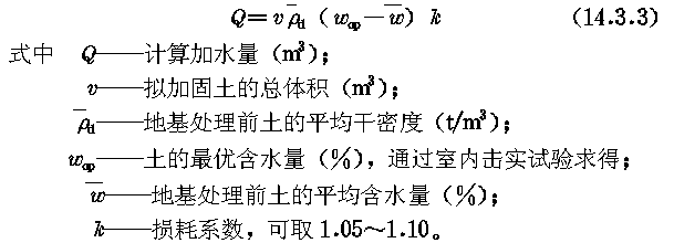 14.3.3 成孔时,地基土宜接近最优(或塑限)含水量,当土的含水量低于12%时,宜对拟处理范围内的土层进行增湿,增湿土的加水量可按 下式 估算: