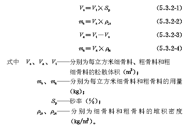 7根据粗细骨料的类型,按本规程第5.2.5条选用粗细骨料总体积,并按 下列公式 计算每立方米混凝土的粗细骨料用量: