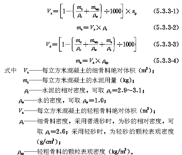 5.3.1 砂轻混凝土和全轻混凝土宜采用松散体积法进行配合比计算,砂轻混凝土也可采用绝对体积法。配合比计算中粗细骨料用量均应以干燥状态为基准。