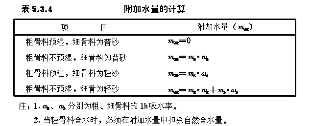 5.3.4 根据粗骨料的预湿处理方法和细骨料的品种,附加水量宜按 表5.3.4 所列公式计算。