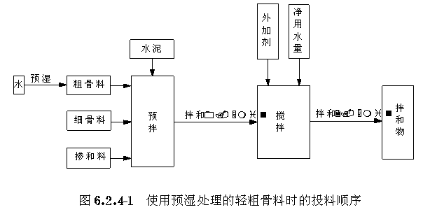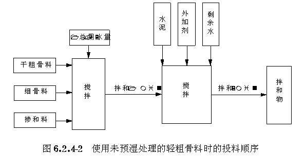 6.2.4 在轻骨料混凝土搅拌时,使用预湿处理的轻粗骨料,宜采用 图6.2.4/1 的投料顺序;使用未预湿处理的轻粗骨料,宜采用 图6.2.4/2 的投料顺序。