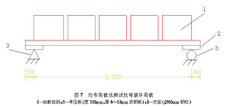 试验方法 6.1 试件状态调整 进行6.4.2试验前,试件应在20℃±3℃,湿度100%的条件下放置48h,作为状态调整。 6.2 外观质量检测 对受测板,视距0.5m左右,目测有无外露纤维、飞边毛刺、贯通裂纹;用精度为0.5mm的钢直尺量测板面裂纹、蜂窝气孔、缺棱掉角数据,并记录缺陷数量。 6.3 尺寸偏差检测 6.3.1 长度 量测三处: 6.3.2 宽度 量测三处: 6.3.3 厚度 量测六处。在各距板两端100mm,两边100mm处布置测点,如图5所示。用精度为0.5mm的钢直尺,或用外卡钳和游标卡尺配合测量,取其算术平均值为检测结果。 6.3.4 表面平整 量测三处。用2m靠尺和楔形塞尺测量。第一处:使靠尺中点位于板中心处;另二处靠尺位置与第一处靠尺位置相对称,且使靠尺的一端位于板边或板端上。取该三处靠尺与板面最大间隙的算术平均值为检测结果。 6.3.5 对角线差 用精度为1mm的钢卷尺量测两条对角线的长度,取其差值为检测结果。 6.3.6 侧向弯曲 通过板边端点沿板面拉直测线,用精度0.5mm的钢直尺量测板侧向弯曲处,取最大值为检测结果。 6.3.7 企口尺寸 用精度为0.5mm的钢直尺,或用游标卡尺、内卡钳、外卡钳在板两端量测接缝槽宽度、深度、榫头宽度、高度、榫槽宽度、深度尺寸。分别取各项目的两个量测数据的算术平均值为该项目的检测结果。 6.4 物理力学性能试验 6.4.1 面密度测试 用量程不小于100kg,精度高于1kg的台秤称量板重。按(2)式计算轻质条板的面密度,精确至0.1kg/m2,取整数为检测结果。 6.4.2 干燥收缩值测试 a.仪器设备 b.沿轻质条板板宽方向截取尺寸为60mm×Tmm×Bmm的试件一组三块(T、B见图1)。 c.在所截试件的两侧边平面中心,各钻一个直径6~10mm,深度为13mm的孔洞。在孔洞内灌入水泥水玻璃浆(或其他粘结剂),然后埋置收缩头,收缩头中心线应与试件中心线重合。2h后,检查收缩头安装是否牢固,否则重装。 d.试件放置1d,浸没在水中72h,水温保持在20℃±3℃。 e.将试件从水中取出,用湿布抹去表面水分并将收缩头擦干净。 f.调整万能测长仪平面测帽为平行位置。把试件轻轻放到万能工作台上,调整测量轴线与试件中心线重合。对正读数显微镜的起始示值,立即测定试件初始长度,并按该仪器的毫米刻尺的修正值表校正。 g.将试件置于调温调湿箱内,控制箱内温度为50℃±1℃,相对湿度为(30±2)%(箱内湿度降至35%时,放入盛有氯化钙饱和溶液的瓷盘,用以调节箱内湿度;如果湿度不易下降时,用无水氯化钙调节)。 h.每天从箱内取出试件一次。当试件取出后立即放入无吸湿剂的干燥装置中,在20℃±2℃的房间内冷却到表面温度为20℃±2℃时进行测试,测前必须按6.4.2f所述重新调整万能测长仪,要求每组试件应在10min内测完。 i.按6.4.2g、6.4.2h所述反复进行干燥、冷却和测试,直到连续3d内任意2d的测长读数差小于0.01mm为止,此值即为试件干燥后长度。 j.干燥收缩值按(3)式计算: S=(l1-l2/l1-l)×1000 式中: S——干燥收缩值,mm/m; k.以三块试件试验值的算术平均值为检测结果。平均值精确至0.1mm/m。 6.4.3 空气隔声量测试 按GBJ75的规定进行。 6.4.4 耐火极限测试 按GB9978的规定进行。 6.4.5 燃烧性测试 按GB8625的规定进行。 6.4.6 抗弯破坏荷载测试 将完成面密度测试的轻质条板简支在长度大于板宽的两个平行支座上(见图7),其一为固定铰支座,另一为滚动铰支座,支座中间间距调至(L-100)mm,两端探出长度相等。先空载静置2min,然后分五级加载,每级为破坏荷载的20%。用堆载方式从中间向两端均匀加载共计五堆,堆长相等,间隙均匀。 每级加载后静置2min,记录板背面出现贯通裂纹时的加载总和作为检测结果。 6.4.7 抗冲击强度度测试 如图8所示组装并固定轻质隔墙,墙宽1800mm,上下钢管中心间距(L-100)mm,板缝用水泥水玻璃砂浆粘结,板与板之间挤紧,接缝槽用玻璃纤维布塔接,并用水泥水玻璃砂浆刮平。1d后将如图9所示装有30kg粒径2mm以下细砂的标准砂袋用直径15mm的绳子固定在中心距板面100mm的钢环上,绳长(L-1650)mm。以绳长为半径沿圆弧将砂袋在与板面垂直的平面内拉开,使其重心提高500mm(标尺测量),然后自由摆动下落冲击设定位置,反复三次,目测板背面有无贯通裂纹,记录检测结果。 6.4.8 吊挂力测试 a.在板中高2000mm处,凿深×长×宽为50mm×40mm×90mm的孔洞,扫清残灰后,用水泥水玻璃浆(或其他粘结剂)粘结如图10所示的钢板吊挂件。吊挂件孔与板面间距100mm,2h后,检查吊挂件安装是否牢固,否则重装。 b.将条板如图11所示固定,上下钢管间距(L-100)mm。 c.通过钢板吊挂件的圆孔,分两级加载,第一级加载400N,静置2min,再加载400N,静置24h,观察板面有无贯通裂纹,吊挂区周围有无破损。记录检测结果。 |