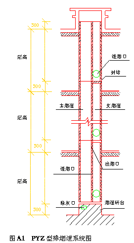 附录A 住宅厨房排烟道系统构成(参考件) A1由排烟道构成的排烟道系统如图A1PYZ型排烟道系统图、图A2PYD型排烟道系统图。 A1.1 PYZ型排烟道构成的排烟系统,烟气由送烟口沿支烟道通过主支连通的支烟道出烟口进入主烟道,再由主烟道通向屋顶向大气中排出。顶层排烟则由支烟道直接排入大气中。PYD型排烟道构成的排烟系统则由各层的排烟通道直接通向屋顶排入大气中。 A1.2 住宅层数为三层以上时(含三层),应采用PYZ型排烟道。 A2排烟道系统局部尺寸 A2.1 排烟道与炉灶连接的进烟口位置,应根据设计确定。排烟道出屋面高度宜采用图A1、图A2中标注尺寸。 A2.2 排烟道系统底部应砌砖台,砖台高度宜为300mm,也可根据设计确定。 A2.3 PYZ型排烟道系统应在底部砖台中设置除灰口,除灰口面积不宜小于120mm×120mm。 A3排烟道系统组装 A3.1 底层排烟道应装于砖台上,逐层安装时,每节排烟道接口必须座浆严实。所用砂浆的强度等级不得低于M5级。 A3.2 每一楼层的排烟道组装时,应将支烟道隔断,隔断处宜用砖堵封塞,并用砂浆抹严。 A3.3 安装排烟道时,应在每段烟道的两端紧绕两道8号镀锌铁丝与邻接墙身锚固连接,以保持侧向稳定。 A3.4 安装时应严格按产品编号的位置进行安装。 |