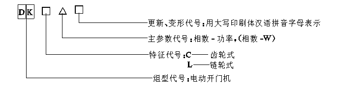分类 4.1 主参数及其系列 电动开门机的主参数为电动机功率及相数。主参数系列应符合表1的规定。 4.2 型式 按传动方式分为齿轮式和链轮式两种型式。 4.3 型号 电动开门机型号由组型代号、特征代号、主参数代号、更新及变型代号组成。其型号说明如下:示例: a)电源为单相220V、功率为180W的齿轮式电动开门机: 电动开门机DKC1/180JG/T3052 b)电源为三相380V、功率为370W,第一次更新设计的链轮式电动开门机: 电动开门机DKL3/370AJG/T3052 4基本参数 电动开门机的基本参数应符合表2的规定。 |