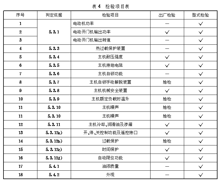 检验规则 检验分为出厂检验和型式检验。 7.1 出厂检验 产品出厂前,每台必须经制造厂质检部门按产品图样、技术要求及产品验收技术条件检验合格,并签发合格证,方能出厂。若生产工艺条件允许,可采用GB/T2828标准进行抽检。 7.1.1 检验项目 检验项目见表4,其中抽检项目按产品数量百分之一进行检验。 7.1.2 判定规则 所有项目合格,判为合格品。 7.2 型式检验 有下列情况之一时,应进行型式检验: a)新产品定型鉴定时; b)正式生产后,当结构材料、工艺有较大改变,可能影响产品性能时; c)停产三年以上,恢复生产时; d)国家质量监督机构提出进行型式检验要求时。 7.2.1 型式检验项目 检验项目见表4。 7.2.2 抽样方法和判定规则 从任意一批出厂检验合格产品中随机抽取三台,进行型式检验。 若第1~16项合格,第17、18项中有一项不合格,则判定该批为合格;当第1~16项中有一项不合格,第17、18项合格,则应加倍抽检,如第1~16项中仍有一项不合格,或第17、18项均不合格,则判定该批不合格;若第1~16项合格,第17、18项均不合格,应对第17、18项加倍抽验,其中任意一项不合格,则判定该批不合格。 |