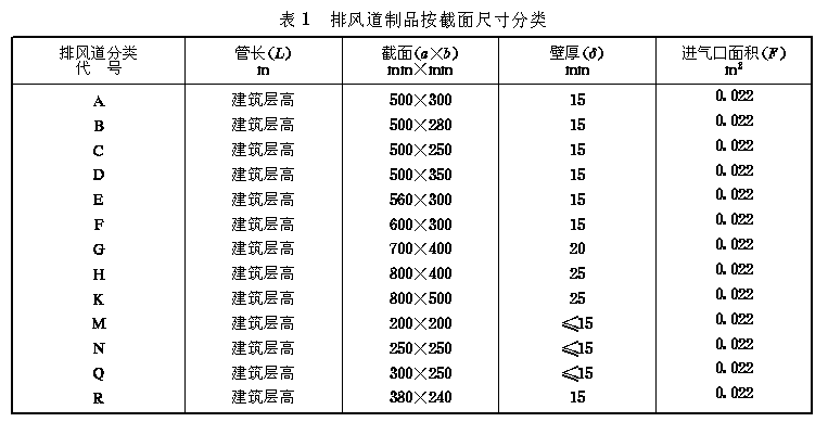分类及型号编制 5.1 排风道分类 5.1.1 排风道制品按截面尺寸分类,其代号见表1。 5.1.2 排风道制品按进风口开口方向分三种类型,其代号分别为Z、Y、H,见图3。(Z为左进风口开口方向,Y为右进风口开口方向,H为侧进风口开口方向) 5.1.3 建设物总层数代号:9代表总层数为九层,6代表总层数为六层,5代表总层数为五层,依此类推。 5.1.4 排风道按安装在某层楼层数位置代号。代号分别为:0,1,2,3,4,…… 5.1.4.1 依楼层的高低,按1,2,3,4,……层楼的顺序安装要求的排风道,应分别标上:1,2,3,4,……的层数代号。 5.1.4.2 没有按楼层的高低顺序安装要求的排风道,即排风道可以任意安装的,其代号为:0。 5.2 排风道型号编制图例 标记示例:截面尺寸为500mm×280mm,进风口在右侧,建筑物总层数为六层且安装于第三层的排风道, 其代号为: PCBY6/3JB/T3044 标记示例:截面尺寸为500mm×300mm, 进风口在左侧,建筑物总层数为五层且没有安装顺序要求,即可任意安装的住宅厨房排风道代号: PCAZ5-0JG/T3044 |