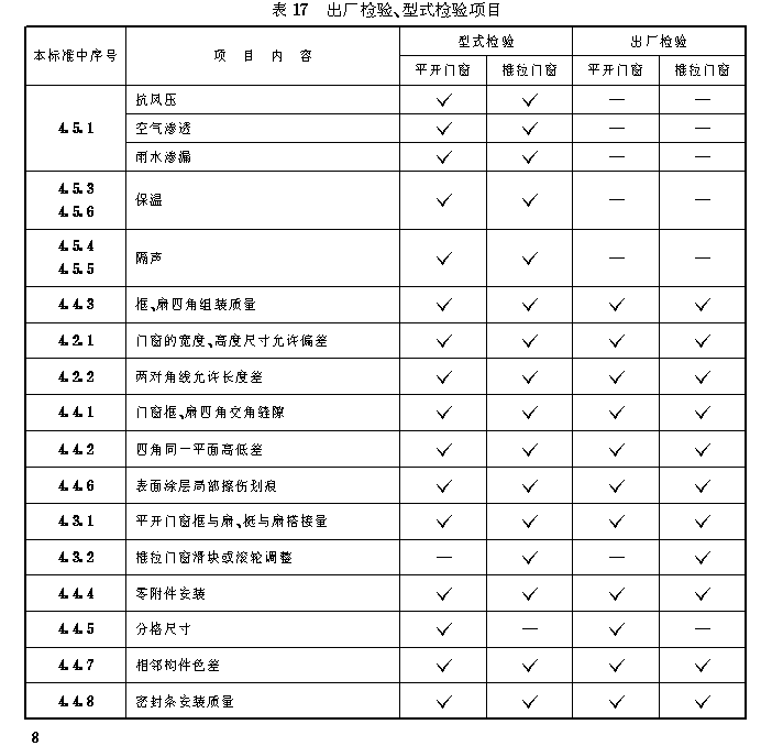 检测规则 6.1 出厂检测 6.1.1 应在型式检验合格后的有效期内进行出厂检查,否则检验结果无效。 按供需双方协议要求,选定产品出厂检验的合格指标作为判定合格品的依据。 6.1.2 抽样方法:按合同号随机抽检10%,且不少于5樘。 6.1.3 判定规则:根据表17的出厂检验项目及附录B(标准的附录)项目分类进行检测,按品种不同,其关键项目、主要项目必须达到各自要求,一般项目必须三项以上(含三项)达到要求者为合格品。当其中有一樘不符合本标准要求时,应加倍抽检,若其中仍有一樘不符合要求时,则判定该批均为不合格应全部返修,复检合格后方可出厂。 6.1.4 彩板门窗出厂检验项目见表17,项目分类、量具及检测方法见附录B。 6.2 型式检验 6.2.1 有下列情况之一时,应进行型式检验: a)新产品或老产品转厂生产的试制定型鉴定; b)正式生产后,当结构、材料、工艺有较大改变,可能影响产品性能时; c)正常生产时,定期每三年检测一次; d)产品长期停产后,恢复生产时; e)出厂检验结果与上次型式检验有较大差异时; f)国家质量监督机构提出进行型式检验要求时。 6.2.2 型式检验项目见表17,按本标准规定的方法进行检测。 6.2.3 抽样方法:批量生产时,每三年由出厂检验合格的产品中随机抽取三樘进行型式检验。 6.2.4 型式检验判定规则: 根据表17规定的型式检验项目进行检验,按各项指标要求作为判定合格品的依据。当其中某项不符合技术要求时,应加倍抽样复检,如该项仍不合格,则判定该批产品为不合格品。 |