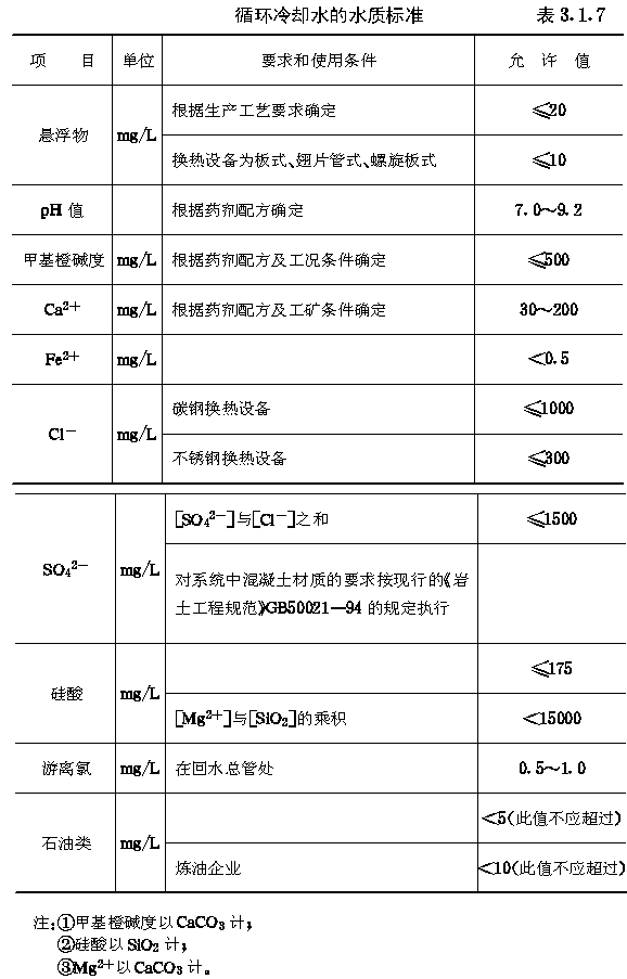 循环冷却水处理 3.1 一般规定 3.1.1 循环冷却水处理设计方案的选择,应根据换热设备设计对污垢热阻值和腐蚀率的要求,结合下列因素通过技术经济比较确定: 3.1.1.1 循环冷却水的水质标准; 3.1.1.2 水源可供的水量及其水质; 3.1.1.3 设计的浓缩倍数(对敞开式系统); 3.1.1.4 循环冷却水处理方法所要求的控制条件; 3.1.1.5 旁流水和补充水的处理方式; 3.1.1.6 药剂对环境的影响。 3.1.2 循环冷却水用水量应根据生产工艺的最大小时用水量确定,供水温度应根据生产工艺要求并结合气象条件确定。 3.1.3 补充水水质资料的收集与选取应符合下列规定: 3.1.3.1 当补充水水源为地表水时,不宜少于一年的逐月水质全分析资料; 3.1.3.2 当补充水水源为地下水时,不宜少于一年的逐季水质全分析资料; 3.1.3.3 循环冷却水处理设计应以补充水水质分析资料的年平均值作为设计依据,以最差水质校核设备能力。 3.1.4 水质分析项目宜符合本规范附录A的要求。 3.1.5 敞开式系统中换热设备的循环冷却水侧流速和热流密度,应符合下列规定: 3.1.5.1 管程循环冷却水流速不宜小于0.9m/s; 3.1.5.2 壳程循环冷却水流速不应小于0.3m/s。当受条件限制不能满足上述要求时,应采取防腐涂层、反向冲洗等措施; 3.1.5.3 热流密度不宜大于58.2kW/m 2 。 3.1.6 换热设备的循环冷却水侧管壁的污垢热阻值和腐蚀率应按生产工艺要求确定,当工艺无要求时,宜符合下列规定: 3.1.6.1 敞开式系统的污垢热阻值宜为1.72×10-4~3.44×10 - 4 m 2 ·K/W; 3.1.6.2 密闭式系统的污垢热阻度宜小于0.86×10 - 4 m 2 ·K/W。 3.1.6.3 碳钢管壁的腐蚀率宜小于0.125mm/a,铜、铜合金和不锈钢管壁的腐蚀率宜小于0.005mm/a。 3.1.7 敞开式系统循环冷却水的水质标准应根据换热设备的结构形式、材质、工况条件、污垢热阻值、腐蚀率以及所采用的水处理配方等因素综合确定,并宜符合表3.1.7的规定。 3.1.8 密闭式系统循环冷却水的水质标准应根据生产工艺条件确定。 3.1.9 敞开式系统循环冷却水的设计浓缩倍数不宜小于3.0。浓缩倍数可按下式计算: N=Q m /(Q b +Q w ) (3.1.9) 式中N——浓缩倍数; 3.1.10 敞开式系统循环冷却水中的异养菌数宜小于5×10 5 个/mL;粘泥量宜小于4mL/m 3 。 |