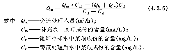 旁流水处理 4.0.1 循环冷却水处理设计中有下列情况之一时,应设置旁流水处理设施: 4.0.1.1 循环冷却水在循环过程中受到污染,不能满足循环冷却水水质标准的要求; 4.0.1.2 经过技术经济比较,需要采用旁流水处理以提高设计浓缩倍数; 4.0.1.3 生产工艺有特殊要求。 4.0.2 旁流水处理设计方案应根据循环冷却水水质标准,结合去除的杂质种类、数量等因素综合比较确定。 4.0.3 敞开式系统采用旁流过滤方案去除悬浮物时,其过滤水量可按下式计算:公式 4.0.4 敞开式系统的旁流过滤水量亦可按循环水量的1%~5%或结合国内运行经验确定。 4.0.5 密闭式系统宜设旁滤处理设施,旁滤量宜为循环水量的2%~5%。 4.0.6 当采用旁流水处理去除碱度、硬度、某种离子或其它杂质时,其旁流水量应根据浓缩或污染后的水质成份、循环冷却水水质标准和旁流处理后的出水水质要求等按下式计算确定:公式 |