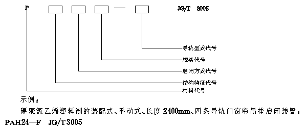 3.3型号 示例: 硬聚氯乙烯塑料制的装配式、手动式、长度2400mm、四条导轨门窗帘吊挂启闭装置: PAH24—FJG/T3005