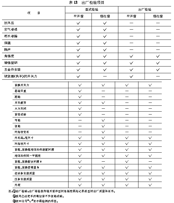 检验规则 6.1 出厂检验 应在型式检验合格后的有效期内进行出厂检验,否则检验结果无效。 6.1.1 出厂检验项目见表13。按本标准规定的方法检测,不合格的产品不允许出厂。 6.1.2 抽样方法 产品出厂前,应按每一批次、品种,规格随机抽样,抽检量不得少于3樘。 6.1.3 产品出厂应有检验合格证书。 6.1.4 产品出厂检验判定规则 根据表13规定的出厂检验项目,检验塑料窗的性能。当其中某项不合格时,应加倍抽样。对不合格的项目进行复检,如该项仍不合格,则判定该批产品为不合格品。经检验若全部检测项目符合本标准规定的合格指标,则判定该批产品为合格品。 注:如有必要,出厂检验也可按有关各方协议的技术要求进行。 6.1.5 塑料窗的建筑物理性能(抗风压、空气渗透、雨水渗漏、保温、隔声性能)和力学性能(锁紧器的开关力、窗扇开关力、悬端吊重、翘曲、开关疲劳、大力关闭、窗撑试验、角强度、弯曲、扭曲、对角线变形等)应符合订货合同中的要求。在定货合同中未提出要求的,则其建筑物理性能和力学性能应不低于本标准规定的合格指标。 6.2 型式检验 6.2.1 有下列情况之一时应进行型式检验: a.新产品或老产品转厂生产的试制定型鉴定; b.正式生产后,当结构、材料、工艺有较大改变而可能影响产品性能时; c.正常生产时,每两年检测一次; d.产品长期停产后,恢复生产时; e.出厂检验结果与上次型式检验有较大差异时; f.国家质量监督机构提出进行型式检验要求时。 6.2.2 型式检验项目见表13,按本标准规定的方法检测。 6.2.3 抽样方法:批量生产时,每二年从合格产品中随机抽取3樘进行型式检验。 6.2.4 型式检验判定规则 根据表13规定的型式检验项目,检验塑料窗的性能。当其中某项不合格时,应加倍抽样。对不合格的项目进行复检,如该项仍不合格,则判定该批产品为不合格品。经检验,若全部检验项目符合本标准规定的合格指标,则判定该批产品为合格品。 6.3 仲裁检验:当供需双方对产品质量发生争议时,应按本标准由法定检测机构进行仲裁检验。 |