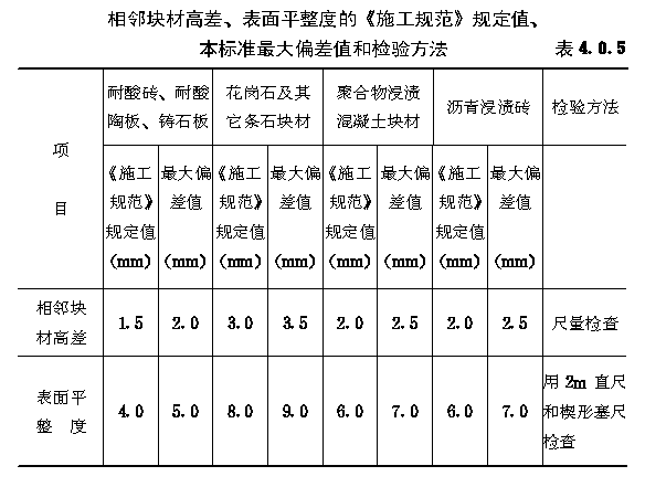 块材防腐蚀工程 4.0.1 本章适用于块材防腐蚀工程的质量检验和评定。 4.0.2 块材防腐蚀工程的检查数量应符合本标准第3.1.3条的规定。 4.0.3 保证项目的质量检验应符合下列规定: 4.0.3.1 耐酸砖、耐酸陶板、铸石板、花岗石及其它条石等的品种、规格和性能应符合设计要求或《施工规范》的规定。当进行现场抽样检测时,耐酸砖、耐酸陶板、铸石板应检查耐酸率、吸水率和热稳定性;花岗石及其它条石应检查耐酸率、吸水率、浸酸安定性和抗压强度。 检验方法:检查产品出厂合格证或复验报告。 4.0.3.2 用于铺砌块材的各种胶泥或砂浆的原材料及制成品的质量要求、配合比、配制方法及铺砌块材的要求等,应符合本标准有关章节中的条款规定。 4.0.4 基本项目的质量检验应符合下列规定:块材结合层、灰缝的施工质量: 合格:块材结合层、灰缝应饱满密实、粘结牢固,不得有疏松、十字通缝、重叠缝和裂纹等现象。结合层厚度和灰缝宽度应符合《施工规范》的规定。 优良:在合格的基础上,灰缝均匀整齐,平整一致。 检验方法:观察、尺量和敲击法检查。 4.0.5 允许偏差项目的质量检验应符合下列规定: 4.0.5.1 坡度应符合设计要求,其允许偏差为坡长的0.2%,但最大偏差值不得大于30mm。 检验方法:尺量检查和泼水试验。 4.0.5.2 相邻块材高差、表面平整度的《施工规范》规定值、本标准最大偏差值和检验方法应符合表4.0.5的规定。相邻块材高差、表面平整度的《施工规范》规定值、本标准最大偏差值和检验方法表4.0.5。 |