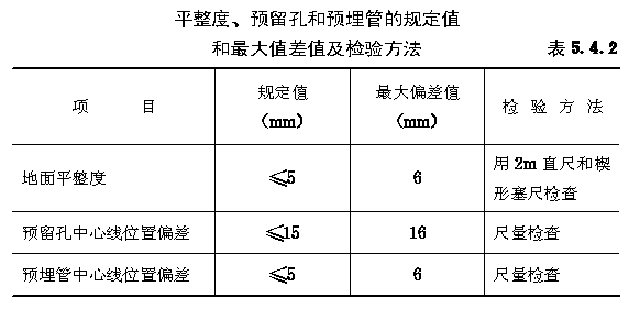 5.4 沥青砂浆和沥青混凝土铺筑的防腐蚀整体面层或垫层 5.4.1 基本项目的质量检验应符合下列规定: 5.4.1.1 沥青砂浆和沥青混凝土整体面层的外观质量: 合格:表面密实平整、无裂缝、无空鼓。 优良:在合格的基础上表面光洁。 检验方法:观察检查。 5.4.1.2 面层与基层的粘结质量: 合格:冷底子油涂刷完整均匀、面层与基层结合牢固、无脱层缺陷。 优良:在合格的基础上,无起鼓。 检验方法:敲击法检查。 5.4.1.3 沥青砂浆和沥青混凝土摊铺时,施工缝的留设: 合格:留槎位置正确,搭接严密。 优良:在合格的基础上,不露接槎痕迹。 检验方法:观察检查。 5.4.1.4 整体楼地面面层与转角处、地漏、门口处的质量: 合格:结合严密、粘结牢固、无渗漏、无空鼓。 优良 :在合格的基础上,表面洁净、接缝平整均匀。 检验方法:观察检查和敲击法检查。 5.4.2 允许偏差项目的质量检验应符合下列规定: 5.4.2.1 地面面层的平整度和坡度的允许偏差和检验方法应符合本标准第3.2.3条的规定。 5.4.2.2 沥青混凝土地面平整度、构筑物预留孔、预埋管中心线位置的规定值、最大偏差值及检验方法应符合表5.4.2的规定。 |