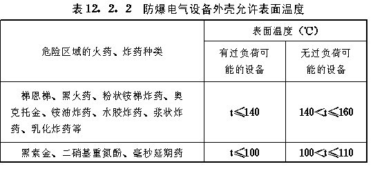 12.2 电气设备 12.2.1 在危险区域安装的电气设备必须是符合国家现行标准的产品。对正常运行和操作时能发生电火花的电气设备,应安装在危险区域以外。 12.2.2 危险区域的电气设备选型应符合下列规定: 1F0区不应装设电气设备。 2F1区的电气设备应选择尘密结构(标志为DT)型、Ⅱ类B级隔爆型及适用于火药、炸药危险区域的本质安全型。灯具及控制按纽可选择增安型。各种防爆电气设备外壳表面允许温度应符合表12.2.2的规定。 表12.2.2防爆电气设备外壳允许表面温度 3F2区电气设备应选择防尘型或IP54级防水防尘型,鼠笼型感应电动机可选择封闭型。 4F1区的接线盒,应采用与电气设备相应的防爆型。 5安装在各危险区域的门灯及外墙上的开关,应选择IP54级防水防尘型。生产黑火药的F0区的门灯及安装在外墙外侧的开关可选择增安型。 6F0区的电气照明应采用安装在外墙外侧的IP54级防水防尘型灯具或室外固定式投光灯。生产黑火药的F0区应采用安装在室外固定式的投光灯,固定投光灯与危险区域的距离不宜小于3m。 外墙外侧灯具的透光窗,宜采用双层玻璃的固定窗。 12.2.3 危险区域电气设备的保护,除应执行本章规定外,尚应符合现行国家标准《通用用电设备配电设计规范》(GB50055-93)的有关规定。 12.2.4 在危险区域采用非防爆电气设备进行隔墙传动时,应符合下列规定: 1安装电气设备的工作间,应采用非燃烧体的密实墙与危险区域隔开。 2应采用通过隔墙由填料函密封或同等效果密封措施的传动轴传动。 3安装电气设备工作间出口,应通向非危险区域。 12.2.5 生产时严禁工作人员进入的工作间,其生产用电设备的控制按钮应装在门外,并应与门联锁。 |