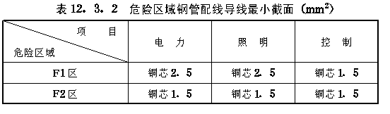 12.3 室内线路 12.3.1 危险区域电气线路的选择,应符合下列规定: 1危险区域的电气线路,应采用绝缘电线穿钢管敷设或采用电缆。电线和电缆的绝缘强度,不应低于该网路的额定电压,且不应低于500V,控制及通信线路绝缘电线和电缆绝缘强度不应低于工作电压,且其绝缘耐压试验电压不应低于500V。 2F0区不应敷设电力和照明线路。灯具安装在外墙外侧的电气线路,应采用截面为2.5mm2及以上的铜芯绝缘导线穿钢管沿建筑物外墙敷设。 12.3.2 F1区、F2区的导线截面选择和配电线路保护,应符合下列规定: 1各危险区域电压为1000V以下导线最小截面应符合表12.3.2的规定。 表12.3.2危险区域钢管配线导线最小截面(mm2) 2危险区域配电线路的短路保护、过负载保护和接地故障保护,应符合现行国家标准《低压配电设计规范》(GB50054-95)的有关规定。 3引向鼠笼型感应电动机的线路,当电压为500V以下时,其长期允许载流量,不应小于电动机额定电流的1.25倍。 12.3.3 当采用电线穿钢管敷设时,应符合下列规定: 1穿电线的钢管,应采用低压流体输送钢管,壁厚不应小于2.5mm。 2穿电线的钢管应对该危险区域密封,并应符合下列要求: 12.3.4 当采用电缆敷设时,应符合下列规定: 1敷设在F1区和F2区的电缆可采用有阻燃型护套的电缆。F1区、F2区可采用移动式带保护线的电缆,F1区为重型,F2区为中型。电缆芯线截面均应按本规范表12.3.2确定。 2电缆宜明敷,在易受意外损伤处的线段应穿钢管保护。当需在电缆沟内敷设时,应采取防止水及有爆炸危险物质侵入沟内的措施,并应将电缆沟过墙洞密封。 3除照明线路外,电缆不应有分支接头。照明线路的分支点应设在接线盒内。 4防爆电气设备的防爆接线盒,应采用电缆引入的型式。 |