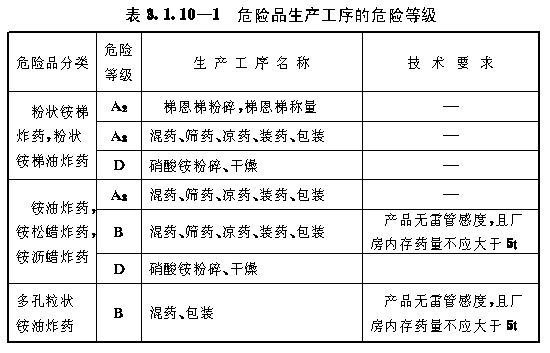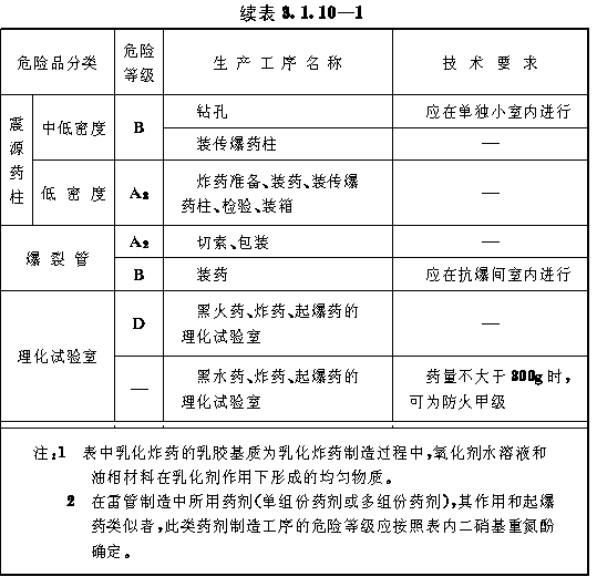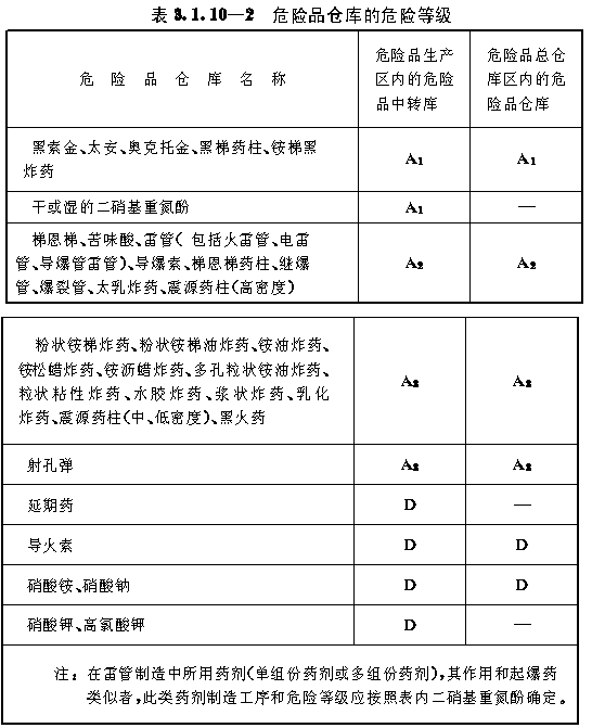 建筑物的危险等级和存药量 3.1 建筑物的危险等级 3.1.1 建筑物的危险等级,应根据建筑物内危险品生产工序的危险等级或危险品仓库危险等级确定。 3.1.2 当建筑物内各生产工序为同一危险等级时,其生产工序的危险等级即为该建筑物的危险等级。 当建筑物内有不同危险等级的生产工序或仓库内贮存有不同危险等级的危险品时,应根据其所含的不同危险等级,按最高者确定该建筑物的危险等级。 3.1.3 建筑物的危险等级应划分为A、B、D级。 3.1.4 当建筑物内制造、加工、贮存的危险品具有整体爆炸危险时,该建筑物危险等级应为A级。A级建筑物又可分为A 1 、A 2 、A 3 级。 3.1.5 A 1 级建筑物应符合下列规定之一: 1当建筑物内制造、加工、贮存的危险品发生事故时,其破坏能力大于梯恩梯者。 2当建筑物内制造、加工、贮存的危险品发生事故时,其破坏能力虽小于梯恩梯,但因其感度较高,易发生事故者。 3.1.6 A 2 级建筑物应符合下列规定之一: 1当建筑物内制造、加工、贮存的危险品发生事故时,其破坏能力与梯恩梯相当者。 2建筑物内制造、加工、贮存内装起爆药、炸药,外有有效防护件(雷管外壳、导爆索包缠物)的产品者。 3.1.7 A 3 级建筑物应为建筑物内制造、加工、贮存的危险品发生事故时,其破坏能力小于梯恩梯者。 3.1.8 B级建筑物应符合下列规定之一: 1当建筑物内制造、加工的危险品具有整体爆炸危险时,但危险作业是在抗爆间室或钢板防护下进行,且建筑物内总存药量不超过200kg者。 2建筑物内制造、加工的危险品很不敏感,不能用单发8号雷管直接引爆者。 3建筑物内制造、加工的起爆药为湿态,使生产危险性显著降低者。 3.1.9 D级建筑物应符合下列规定之一: 1建筑物内制造、加工、贮存的危险品具有燃烧或爆炸危险,但必需在外界强大的引爆条件下才能爆炸者。 2建筑物内制造、加工、贮存危险品具有燃烧危险,但存药量小者。 3.1.10 危险品生产工序的危险等级应符合表3.1.10-1的规定;危险品仓库的危险等级应符合表3.1.10-2的规定。