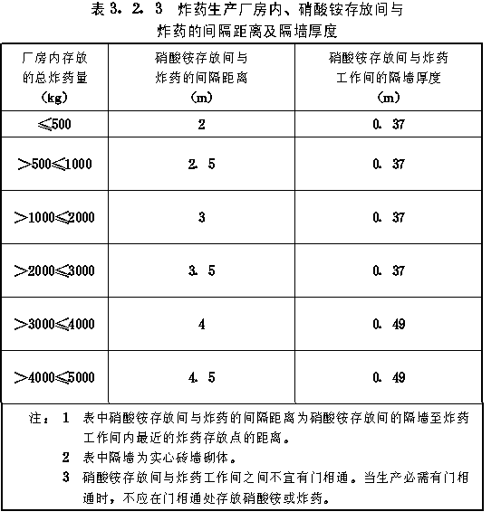 3.2 存药量 3.2.1 建筑物的存药量应包括建筑物内的生产设备、运输设备、运输工具中能形成同时爆炸的药量和暂存的原料、半成品、成品中能形成同时爆炸的药量。 3.2.2 位于厂房外防护屏障内的危险品,应计算在厂房的存药量内。 3.2.3 当炸药生产厂房内的硝酸铵与炸药存放在同一工作间内时,应计算在该厂房的存药量内,硝酸铵可按其存量的一半计算。当硝酸铵为水溶液时,不应计算在该厂房的存药量内。当炸药生产厂房内的硝酸铵与存有炸药的工作间之间有隔墙相隔,并符合表3.2.3要求时,可不计算在该厂房的存药量内。 表3.2.3炸药生产厂房内、硝酸铵存放间与炸药的间隔距离及隔墙厚度 3.2.4 起爆器材的药量应按其产品中各种装填药的总量计算。 3.2.5 有抗爆间室的厂房,其抗爆间室中的药量可不计算在该厂房的存药量内。 3.2.6 当计算抗爆间室结构时,抗爆间室内的存药量应按间室内的全部药量计算。 |