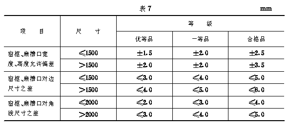 技术要求 4.1 型材及相关五金附件技术要求 4.1.1 推拉窗型材应符合GB2597、GB8717、GB716的规定。 4.1.2 推拉窗所用五金附件、玻璃、密封条等,其质量应与窗的质量等级相适应。 4.2 装配要求 4.2.1 窗框、扇槽口宽度和高度及对角线尺寸允许偏差应符合表7规定。 4.2.2 窗框、扇相邻构件装配间隙,及同一平面相交处的同平面度应符合表8规定。 4.2.3 推拉窗各连接处(焊接、铆接、螺接)应牢固可靠,不允许有假焊、断裂、松动等缺陷。 4.2.4 推拉窗各杆件的直线度应小于1/1000。 4.2.5 推拉窗框、扇配合严密,间隙均匀、其框与扇的搭接宽度不小于4mm,在启闭方向的搭接宽度允许偏差不大于2mm。 4.2.6 推拉窗外表面及配合面,要求光滑平整,不应有毛刺、焊渣及明显的锤痕。 4.2.7 推拉窗五金附件应齐全,安装位置准确、牢固并具有足够的强度,启闭应灵活、无噪音,便于更换。 4.3 推拉窗启闭力应不大于50N。 4.4 推拉窗必须设置安全定位装置。 4.5 推拉窗下框处应设有排水口(或装置)。 4.6 推拉窗表面处理 4.6.1 采用彩板型材的推拉窗,其彩板质量应符合GB/T12754的规定。 4.6.2 采用涂漆、喷漆、烤漆的推拉窗,应进行除油、除锈处理,漆膜质量应符合GB1720、GB1732、GB1735的规定。表面不得有漏漆、堆漆、裂纹等缺陷。 4.6.3 采用静电粉末喷涂的推拉窗要进行磷化前处理,其质量应符合GB6807的规定。并采用耐候性较高的粉末涂料,涂层的质量应符合GB1720、GB1732、GB1735的规定。 |