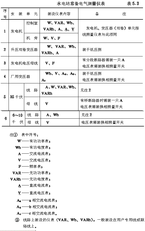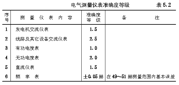第十节 电气测量仪表装置 第5.10.1条 安装在屏、台、柜上的电气测量仪表,其准确度等级不应低于表5.2的规定。 电气测量仪表准确度等级表5.2 第5.10.2条 与仪表连接的分流器、附加电阻和互感器的准确度等级,不宜低于0.5级。仅作电流和电压测量的仪表,可使用1.0级的互感器。对不重要回路的电流表,可用3.0级的电流互感器。 第5.10.3条 选择仪表和互感器的测量范围时,宜使发电机、变压器等电力设备在正常运行情况下,其仪表指示在标度尺工作部分上量限的2/3以上,并在过负荷运行时应有指示。 水电站常备电气测量仪表表5.3 第5.10.4条 出现双向电流的直流回路和双向功率的交流回路中,应装设双向标度的电流表和功率表。当电站需分别计量输出和受入电量时,应装设两只具有逆止器的电度表。 第5.10.5条 电气测量仪表与继电保护装置共用一组电流互感器时,两者应分别接到电流互感器不同的二次绕组上。若受条件限制而需共用电流互感器的同一个二次绕组时,应采取安全技术措施。 第5.10.6条 水电站的常备电气测量仪表,可按表5.3的规定装设。