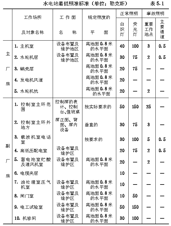 第七节 照明 第5.7.1条 水电站应设正常照明和事故照明分开的供电网络。正常照明应由厂用电系统供电,事故照明电源应由蓄电池组或其他电源供电。 第5.7.2条 在夜间需进行工作和活动的地区,应装设正常照明。当正常照明消失仍需工作的场所和运行人员来往的主要通道均应装设事故照明。 水电站最低的照度标准及需装设事故照明的地点,可参照表5.1确定。 水电站最低照准标准(单位:勒克斯)表5.1-1 水电站最低照准标准(单位:勒克斯)表5.1-2 第5.7.3条 装设于发电机风洞、水轮机坑内及安装高度低于2.5米的灯具,应采取安全措施。检修用的手提灯,其电压不应大于36伏。 第5.7.4条 照明线的零线,不应装设开关和熔断器;单相开关应装在相线上。 第5.7.5条 蓄电池室内,严禁安装分电箱、电源开关、熔断器和插座等设备;室内的照明灯具,应采用防爆型。 第5.7.6条 在特别潮湿的场所,应采用防潮灯具。
