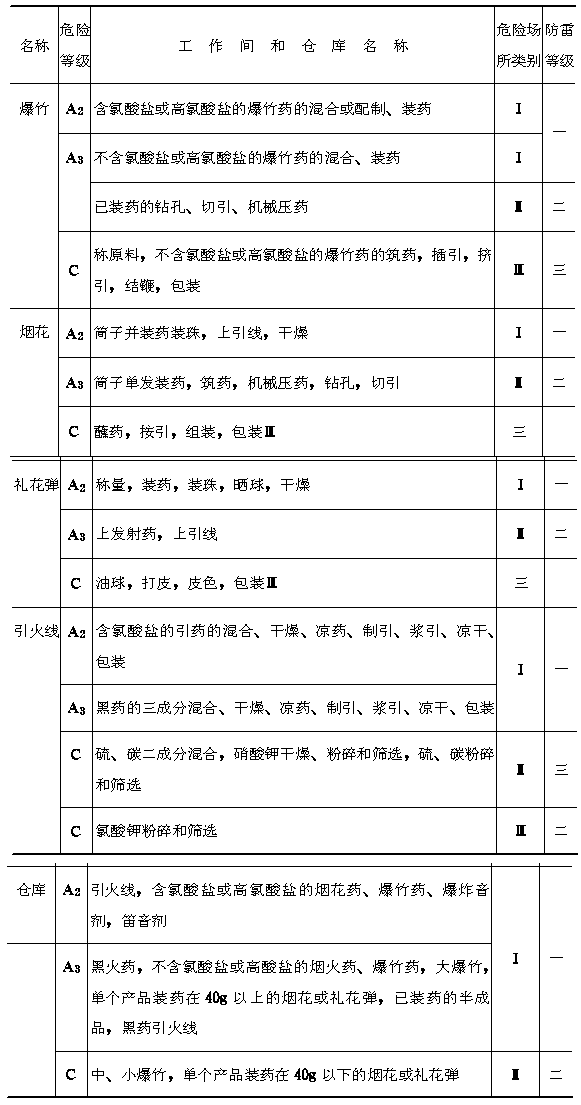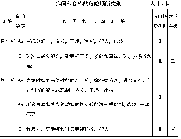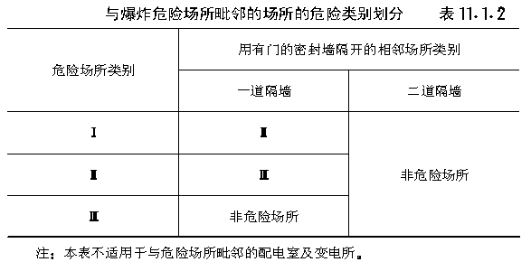 第十一章 危险场所的电气 第一节 危险场所类别的划分 第11.1.1条 工作间和仓库的危险场所类别,应按下列规定划分,并应符合表11.1.1的规定。 一、Ⅰ类危险场所为经常存在大量能形成爆炸危险的烟火药、黑火药及其粉尘的工作间; 二、Ⅱ类危险场所为经常存在少量能形成燃爆危险的烟火药、黑火药及其粉尘的工作间; 三、Ⅲ类危险场所为经常存在能形成火灾危险而爆炸危险性小的危险品及粉尘的工作间。 第11.1.2条 与爆炸危险场所毗邻,并有门相通的工作间,当隔墙为密封墙,门经常处于关闭状态时,该工作间的危险类别可按 表11.1.2 确定。当门经常处于敞开状态时,该工作间应与爆炸危险场所的危险类别相同。 第11.1.3条 排风室危险场所类别的确定,应符合下列规定: 一、为Ⅰ类危险场所服务的排风室,可划为Ⅱ类危险场所; 二、为Ⅱ、Ⅲ类危险场所服务的排风室与所服务的危险场所类别相同; 三、当采用湿式净化装置时,各类危险场所的排风室可划为Ⅲ类危险场所。 |