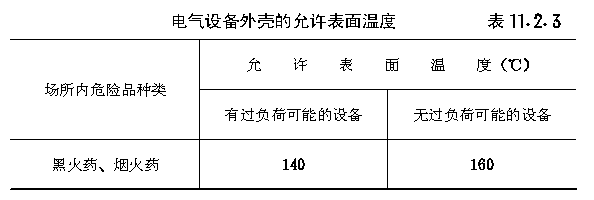 第二节 电气设备 第11.2.1条 在危险场所安装的电气设备,均应按国家产品标准生,并经国家审定合格的定型产品。 第11.2.2条 对正常运行和操作时可能发生电火花或产生高温的电气设备,应安装在危险场所以外。 第11.2.3条 危险场所的电气设备的选型,应符合下列规定: 一、Ⅰ类危险场所,除仪表外,不应装设电气设备。仪表应选择适用于烟火药、黑火药危险场所的本质安全型。 二、Ⅱ类危险场所的电气设备应选择密封防爆型、增安型(只限于灯具及控制按钮)及适用于烟火药、黑火药危险场所的本质安全型。各种防爆电气设备外壳的表面温度,应符合表11.2.3的规定。插座的选择,还应满足在断电后插销才能插入和拔出的要求。 三、Ⅲ类危险场所电气设备应选择密封型、防水防尘型,鼠笼型感应电动机可选择封闭型。 四、Ⅱ类、Ⅲ类危险场所的接线盒,应采用与电气设备相应的防爆型。 第11.2.4条 危险场所电气照明的选型,应符合下列规定; 一、安装在各类危险场所门灯及外墙上的开关,应选择防水防尘型; |
