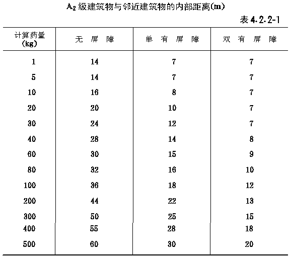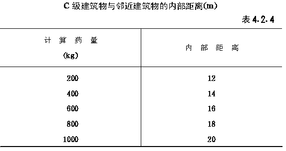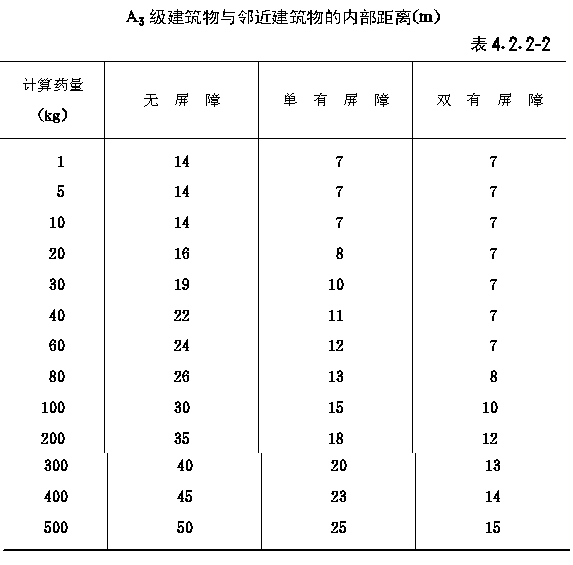 第二节 危险品生产区的内部距离 第4.2.1条 危险品生产区内各建筑物之间的内部距离,应分别按照各危险性建筑物的危险等级及其计算药量所确定的距离和本节各条所规定的距离,取其最大值。并应符合现行国家标准《建筑设计防火规范》中有关厂房防火间距的规定。 注:内部距离均自建筑物的外墙算起。 第4.2.2条 危险品生产区A级建筑物与邻近建筑物的内部距离,应符合下列规定: 一、A2级建筑物与邻近建筑物的内部距离,应按表4.2.2-1确定; 二、A3级建筑物与邻近建筑物的内部距离,应按表4.2.2-2确定。 第4.2.3条 危险品生产区A级建筑物与公用建、构筑物的内部距离,应符合下列规定: 一、与锅炉房的内部距离,应按表4.2.2-1或表4.2.2-2的要求计算后再增加50%,并不应小于100m,2t以下锅炉房不应小于50m; 二、与单建变电所、水塔、地下或半地下高位水池,有明火或散发火星的建筑物的内部距离,应按表4.2.2-1或表4.2.2-2的要求计算后再增加50%,并不应小于50m; 三、与厂区内办公室、食堂、汽车库的内部距离,应按表4.2.2-1或表4.2.2-2的要求计算后再增加50%,并不应小于65m。 第4.2.4条 危险品生产区C级建筑物可不设防护屏障,C级建筑物与邻近建筑物的内部距离,应符合表4.2.4的规定。 第4.2.5条 危险品生产区C级建筑物与锅炉房、水塔、地下或半地下高位水池、变电所、配电所,有明火或散发火星的建筑物、厂区办公室、食堂、汽车库的距离,不应小于50m。 |