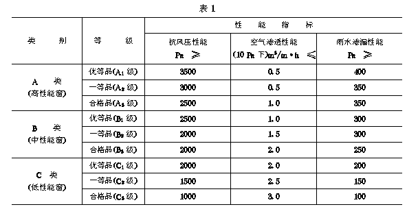 3.1 依据不同建筑物的使用要求,按抗风压、空气渗透、雨水渗漏三项性能指标,将产品划分为A、B、C三类(见