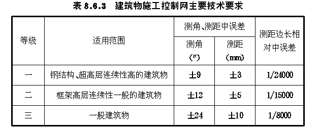 8.6.3 建筑物平面控制网可依据建筑物的不同类型分三级,其主要技术要求应符合 表8.6.3 的要求。