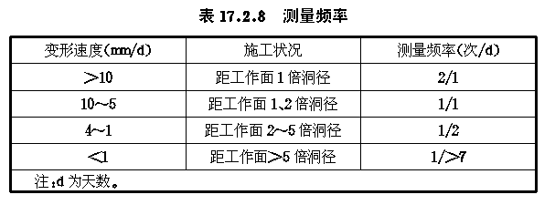 17.2.8 隧道内各项变形测量项目的测量频率,应根据变形速度和变形量的大小以及施工状况按 表17.2.8 的要求进行选择。