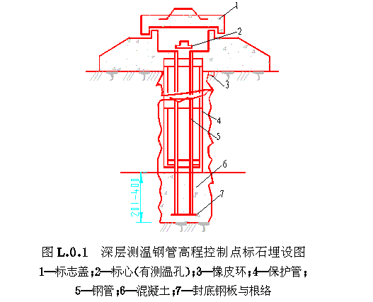 L.0.1 深层测温钢管高程控制点标石埋设图(见 图L.0.1 )。 L.0.2 建筑物变形观测点标志类型和埋设形式(见 图L.0.2 )。 L.0.3 隧道净空水平收敛、拱项下沉和地表沉降观测点布设图 (见 图L.0.3 )。