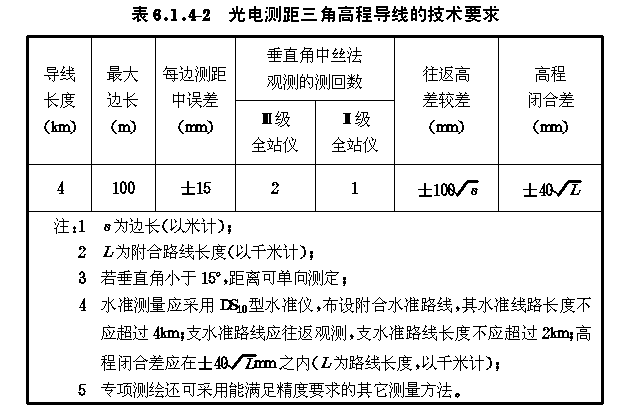 3光电测距三角高程导线可附合在精密水准点或城市等级水准点上,其技术要求应符合 表6.1.4/2 的规定。