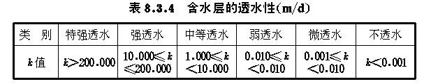 8.3.4 含水层的渗透系数及导水系数宜采用钻孔或探井抽水试验、注水试验求得;含水层的透水性根据渗透系数k值,按 表8.3.4 划分。
