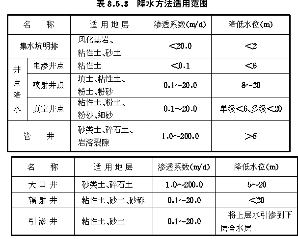 8.5.3 降水方法的适用范围可按 表8.5.3 选用。
