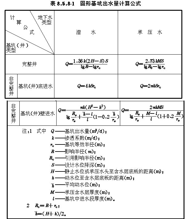 1块状基坑,可简化为圆形,其基坑出水量,可采用“大井法”选择 表8.5.8/1 中的计算公式。