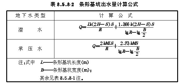 2流向切穿含水层的条形基坑,出水量可选择 表8.5.8/2 中的公式计算。