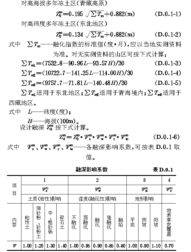 D.0.1 土的季节融化深度。标准融深Z m 0 为衔接多年冻土地基的融化层属非融沉性粘性土,地表平坦,裸露的空旷场地中,多年(不少于10年)实测最大融深的平均值(自融前地面算起)。 标准融深Z m 0 ,应以当地实测资料为准,在无实测资料时可按 下式 计算。