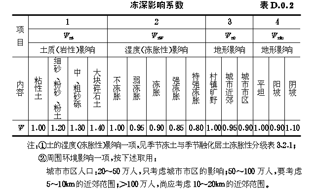 D.0.2 土的季节冻结深度。标准冻深Z 0 为地下水埋深与冻结锋面之间的距离大于2.0m,非冻胀粘性土、地表平坦、裸露、城市之外的空旷场地中,多年(不少于10年)实测最大冻深的平均值(自冻前地面算起)。 设计冻深Zd可按下式计算: Z d =Z 0 ·Ψ zs ·Ψ zw ·Ψ zc ·Ψ zto (D.0.2/1) 式中Ψz s 、Ψ zw 、Ψ zc 、Ψ zto ———各冻深影响系数,按 表D.0.2 查取。