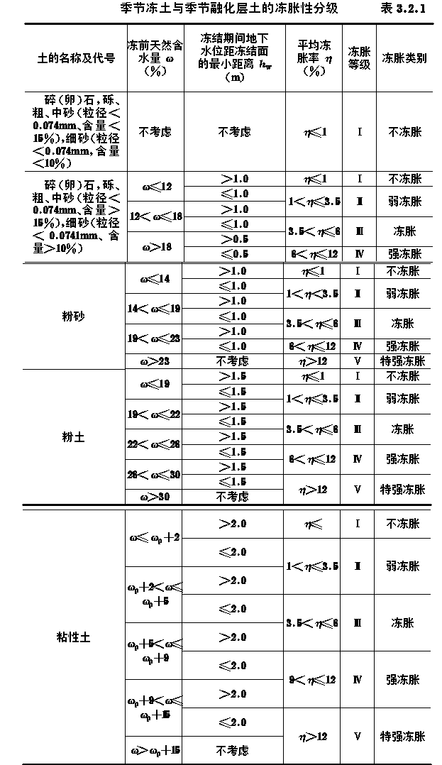 3.2.1 季节冻土和季节融化层土的冻胀性,根据土冻胀率η的大小.按 表3.2.1 划分为:不冻胀、弱冻胀、冻胀、强冻胀和特强冻胀五级。冻土层的平均冻胀率η按下式计算:
