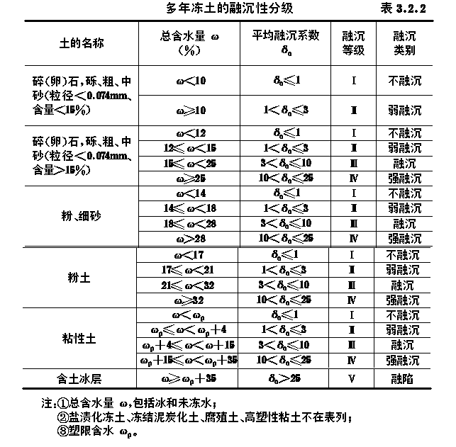表3.2.1注: ①ωp———塑限含水量(%); ω———冻前天然含水量在冻层内的平均值; ②盐渍化冻土水在表列; ③塑性指数大于22时,冻胀性降低一级; ④<0.005mm粒径含量>60%时,为不冻胀土; ⑤碎石类土当填充物大于全部质量的40%时,其冻胀性按填充物土的类别判 定。