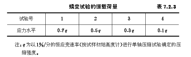 7.2.3.2 蠕变试验的加荷,可按 表7.2.3 给出的四种恒载荷进行,连续试验直到出现破坏,或到试样应变达20%;在低应力情况