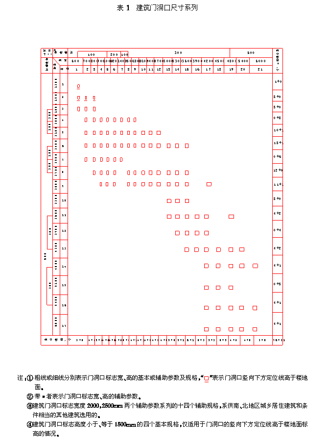 建筑门窗洞口尺寸系列 包括建筑门窗洞口的标志宽、高基本参数和辅助参数,并由这些参数组成选定的基本规格和辅助规格。 3.1 建筑门洞口尺寸系列见表1。 3.2 建筑窗洞口尺寸系列见表2。 注: ①粗线或细线分别表示窗洞口标志宽、高的基本或辅助参数及规格。 ②带0者表示窗洞口标志宽、高的辅助参数。 ③建筑窗洞口标志高度1400,1600mm两个辅助参数系列的十四个窗洞口辅助规格,系供南、北地区城乡居住建筑和条件相当的其他建筑选的。 ④建筑窗洞口标志宽度4500mm辅助系数系列的十个辅助规格,系供工业等建筑纵、横外墙适当部位选用的。 |