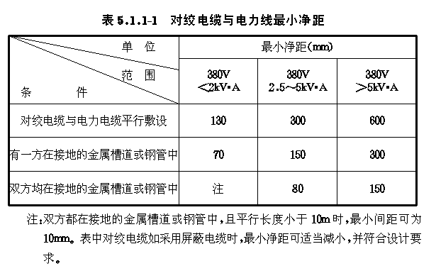 6电源线、综合布线系统缆线应分隔布放。缆线间的最小净距应符合设计要求,并应符合 表5.1.1-1 的规定。