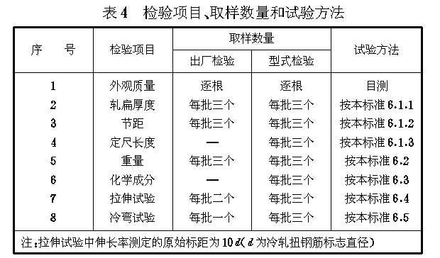 冷轧扭钢筋的出厂检验是以验收批为基础的,其检验项目、取样数量和试验方法应符合 表4 的规定,并将检验结果填入附录B(提示的附录)表B1中。