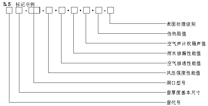 品种规格 3.1 窗厚度基本尺寸系列 3.1.1 窗厚度基本尺寸按窗框厚度构造尺寸区分,见表1。 3.1.2 未列窗厚度尺寸系列,相对于基本尺寸系列在±2mm之内,可靠近基本尺寸系列。 3.2 窗洞口尺寸系列 3.2.1 窗的宽度、高度构造尺寸,主要根据窗框厚度构造尺寸和洞口安装要求确定。 3.2.2 基本窗洞口的规格型号见表2。 3.2.3 除表2规定外,允许窗与窗之间任意组合,组合后的洞口尺寸应符合GB5824的规定。 3.3 按性能区分 3.3.1 依据不同建筑物的使用要求,按风压强度、空气渗透和雨水渗漏三项性能指标,将产品划分为A、B、C三类,见表10。 3.3.2 按空气声隔声性能对产品进行区分,凡空气声计权隔声量≥25dB时为隔声窗,见表11。 3.3.3 按保温性能对产品进行区分,凡传热阻值≥0.25m2·K/W时为保温窗,见表12。 3.4 按表面处理方法区分a.阳极氧化法;b.阳极氧化覆合表膜法。 3.5 标记示例 例1: PLC55-1509-3000·1.50·350·25·0.33-Ⅱ PLC——平开铝合金窗; 55——窗厚度基本尺寸为55mm; 1509——洞口宽度为1500mm,洞口高度为900mm; 3000——风压强度性能值为3000Pa; 1.50——空气渗透性能值为1.50m3/m·h; 350——雨水渗漏性能值为350Pa; 25——空气声计权隔声值为25dB; 0.33——传热阻值为0.33m2·K/W; Ⅱ——阳极氧化膜厚度为Ⅱ级。 例2: HPLC45-1518-2000·1.50·200-TⅠ HPLC——滑轴平开铝合金窗; 45——窗厚度基本尺寸为45mm; 1518——洞口宽度为1500mm,洞口高度为1800mm; 2000——风压强度性能值为2000Pa; 1.50——空气渗透性能值为1.50m3/m·h; 200——雨水渗漏性能值为200Pa; ——隔声、保温性能无要求; TⅠ ——阳极氧化覆合表膜厚度为TⅠ级。 注: 在产品上做标记时,可省略性能和膜厚标记。 |