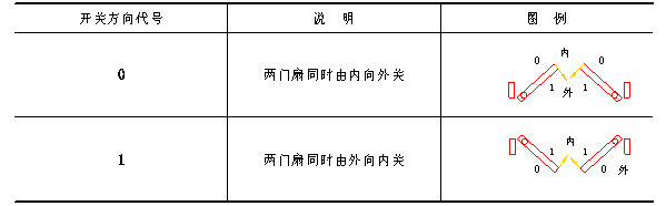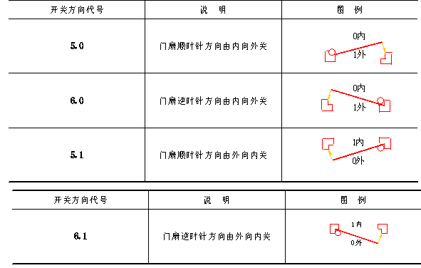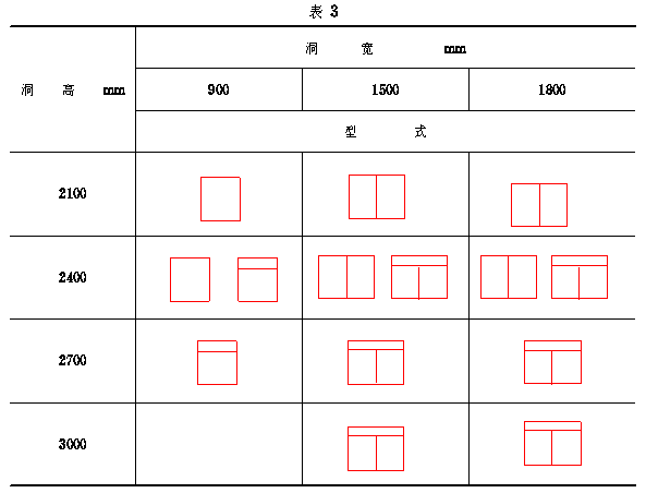 产品分类 3.1 门厚度基本尺寸 门厚度基本尺寸,按门边框厚度构造尺寸区分,见表1。 3.2 门洞口尺寸系列 3.2.1 门的宽度、高度构造尺寸主要根据洞口安装要求确定。 3.2.2 基本门洞口的规格型号见表2。 3.2.3 除表2规定外,允许门与门之间任意组合,组合后的洞口尺寸应符合GB5824的规定。 3.3 门的基本立面型式 a.单扇门 b.单扇门带上亮 c.双扇门 d.双扇门带上亮注: 1)上述基本立面型式见表3。 2)其它型式的门可按用户要求设计制造。 3.4 门扇高度基本尺寸为2100,2400mm两个系列。 3.5 门的单扇质量为30,50,70kg三个等级。 3.6 按门扇结构区分 a.有框门代号为Y b.无框门代号为W 3.7 按探测装置区分 a.微波探测器代号为B b.红外线探测器代号为H c.超声波探测器代号为C d.电磁感应探测器代号为D e.特殊探测器代号为T 3.8 开关方向 3.8.1 单扇门开关方向 表 3.8.2 双扇门开关方向 表 |