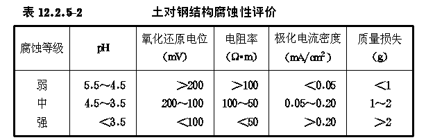 12.2腐蚀性评价 12.2.1 受环境类型影响,水和土对混凝土结构的腐蚀性,应符合 表12.2.1 的规定;环境类型的划分按本规范附录G执行。 12.2.2 受地层渗透性影响,水和土对混凝土结构的腐蚀性评价,应符合 表12.2.2 的规定。 12.2.3 当按表12.2.1和12.2.2评价的腐蚀等级不同时,应按下列规定综合评定: 12.2.5 水和土对钢结构的腐蚀性评价,应分别符合 表12.2.5/1 和 表12.2.5/2 的规定。 12.2.6 水、土对建筑材料腐蚀的防护,应符合现行国家标准《工业建筑防腐蚀设计规范》(GB50046)的规定。 |